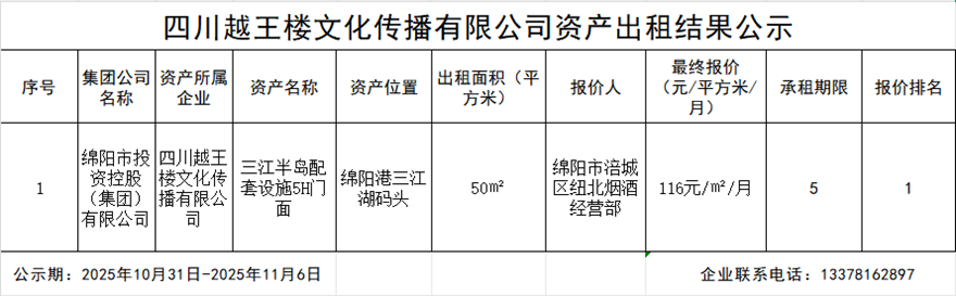 四川越王楼文化传播有限公司资产出租结果公示