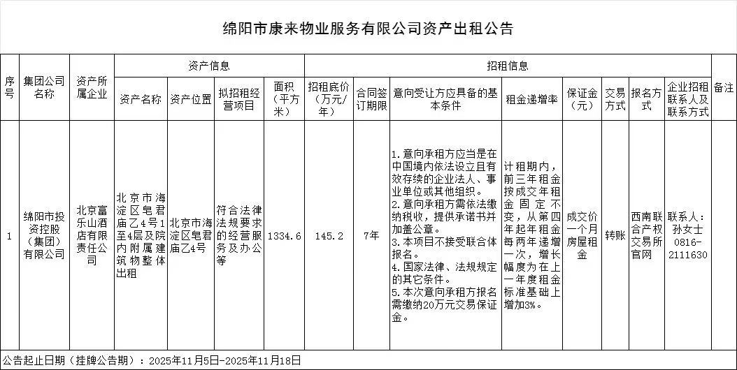 绵阳市康来物业服务有限公司资产出租公告