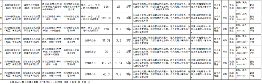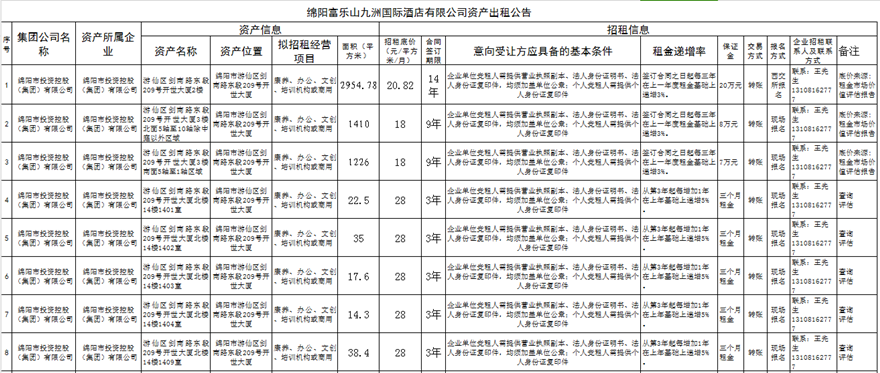 绵阳富乐山九洲国际酒店有限公司资产出租公告