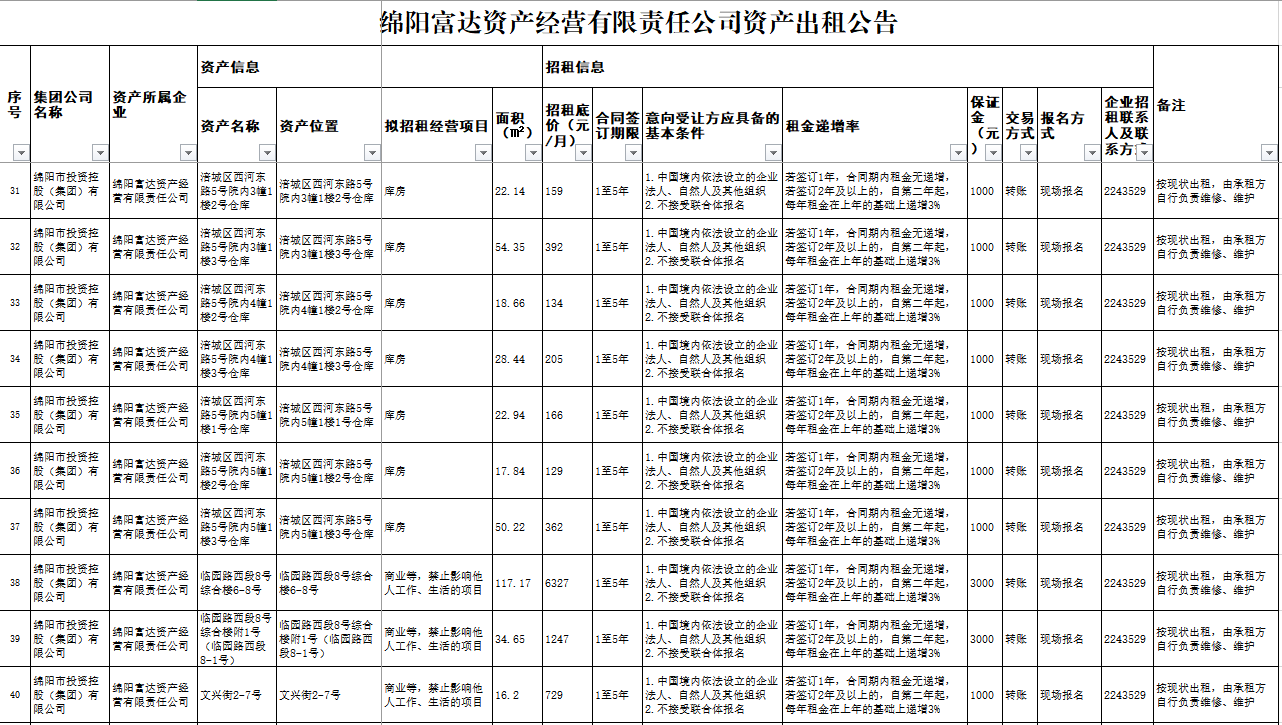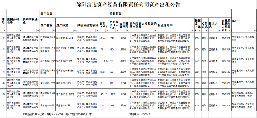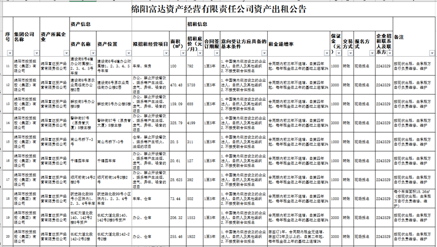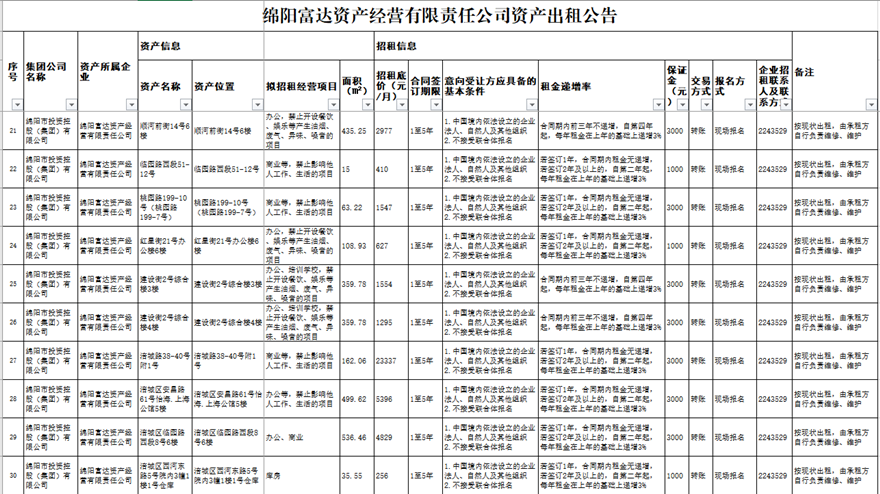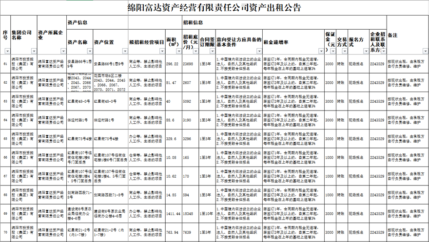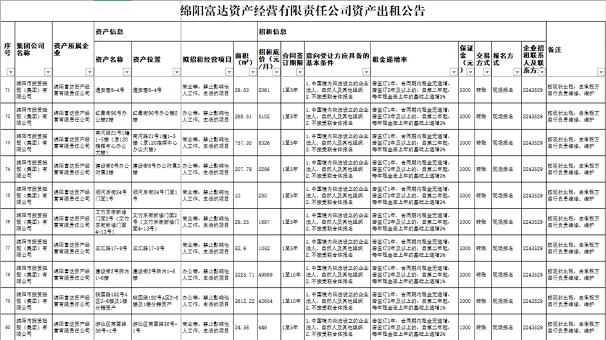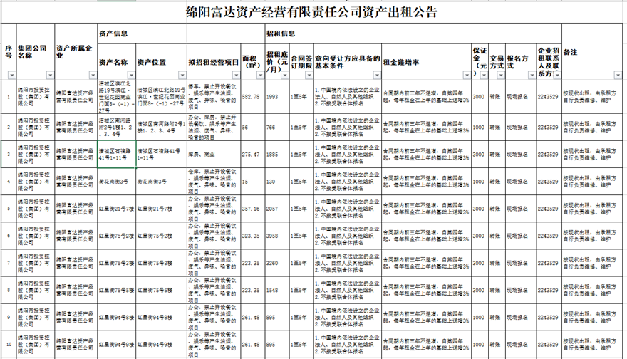 绵阳富达资产经营有限责任公司资产出租公告