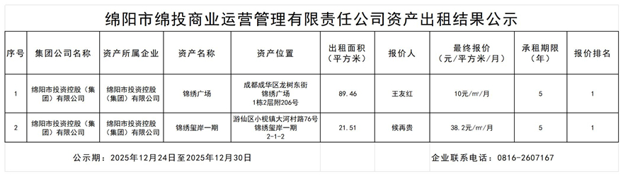 绵阳市伟德源自英国始于1946商业运营管理有限责任公司资产出租结果公示