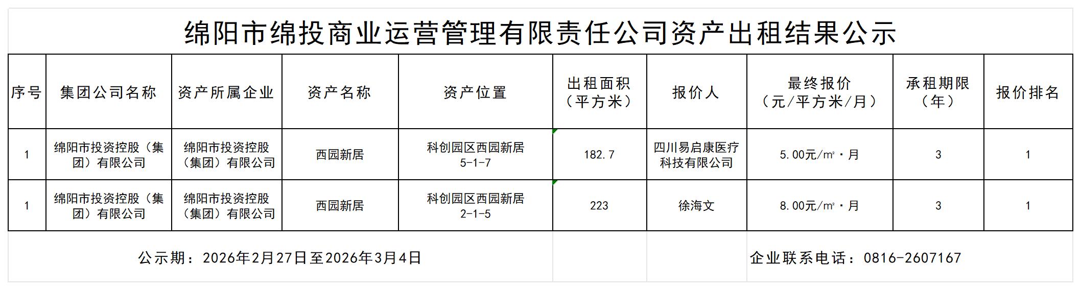 绵阳市伟德源自英国始于1946商业运营管理有限责任公司资产出租结果公示