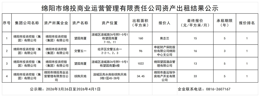 绵阳市伟德源自英国始于1946商业运营管理有限责任公司资产出租结果公示