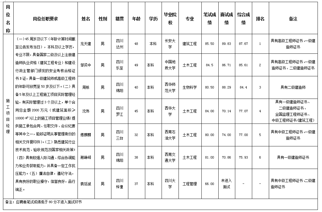 根据四川嘉来建筑工程有限公司发布的关于招聘施工项目经理岗位的公告及招聘相关规定,经笔试、面试等程序,现将笔试(面试)成绩予以公示。