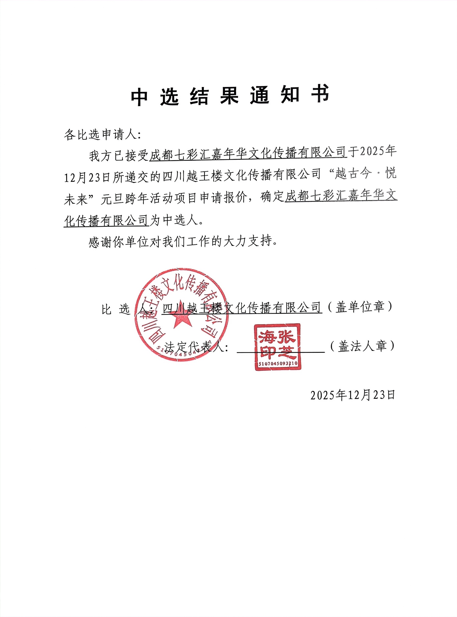 四川越王楼文化传播有限公司“越古今·悦未来”元旦跨年活动项目中选结果公告